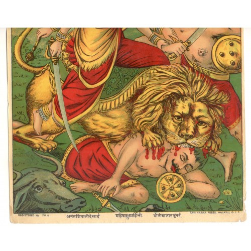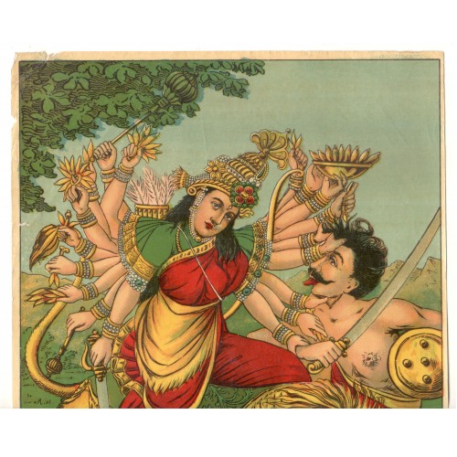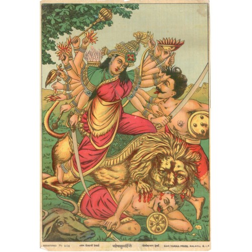 Tags: Raja Ravi Varma, Lithograph, Oleograph, Print, Antique, Vintage, Mahishsurmardini